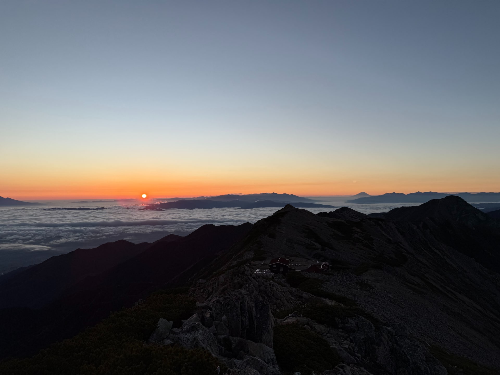 合戦尾根は地味に長くて、登りに3時間弱掛かった。樹林帯の中で急登がずっと続くので、消耗しないようにジリジリと進んでいくのだが、時々富士山や槍ヶ岳がチラ見えするというご褒美があって癒された。そして、最後には山の上にかっこよく立つ燕山荘が出てくる。