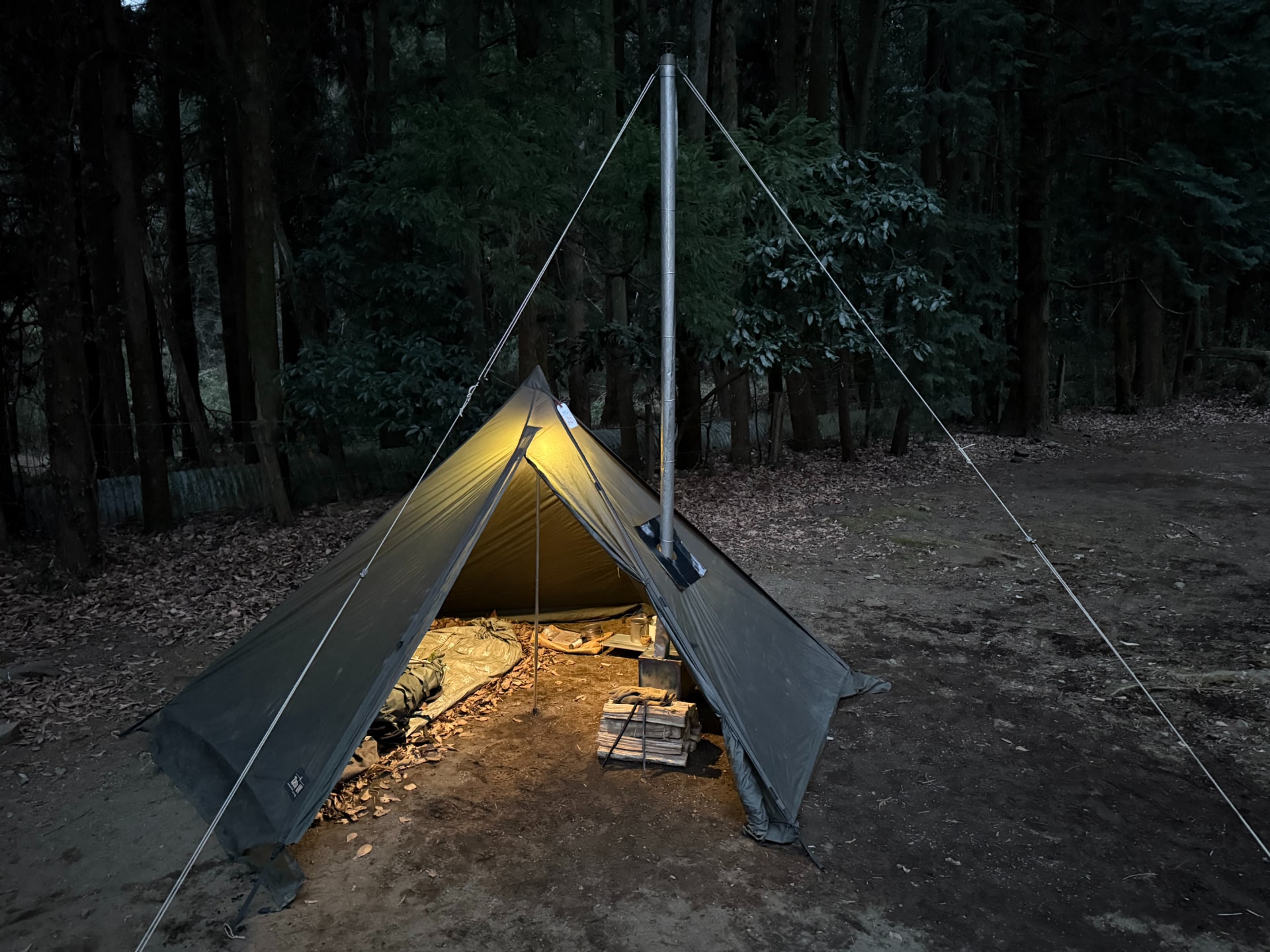 厳選しすぎたせいかグランドシートを忘れて、落ち葉の上で過ごすことになった。野宿感満載になるかと思いきや、ビビィ(寝袋カバー的なやつ)を寝床兼座布団としたら、ギリギリでキャンプという感じに収まった。
