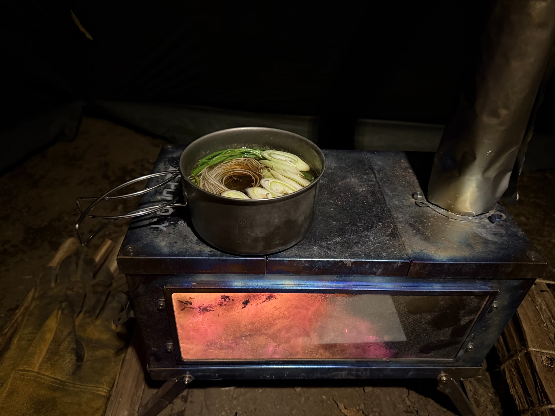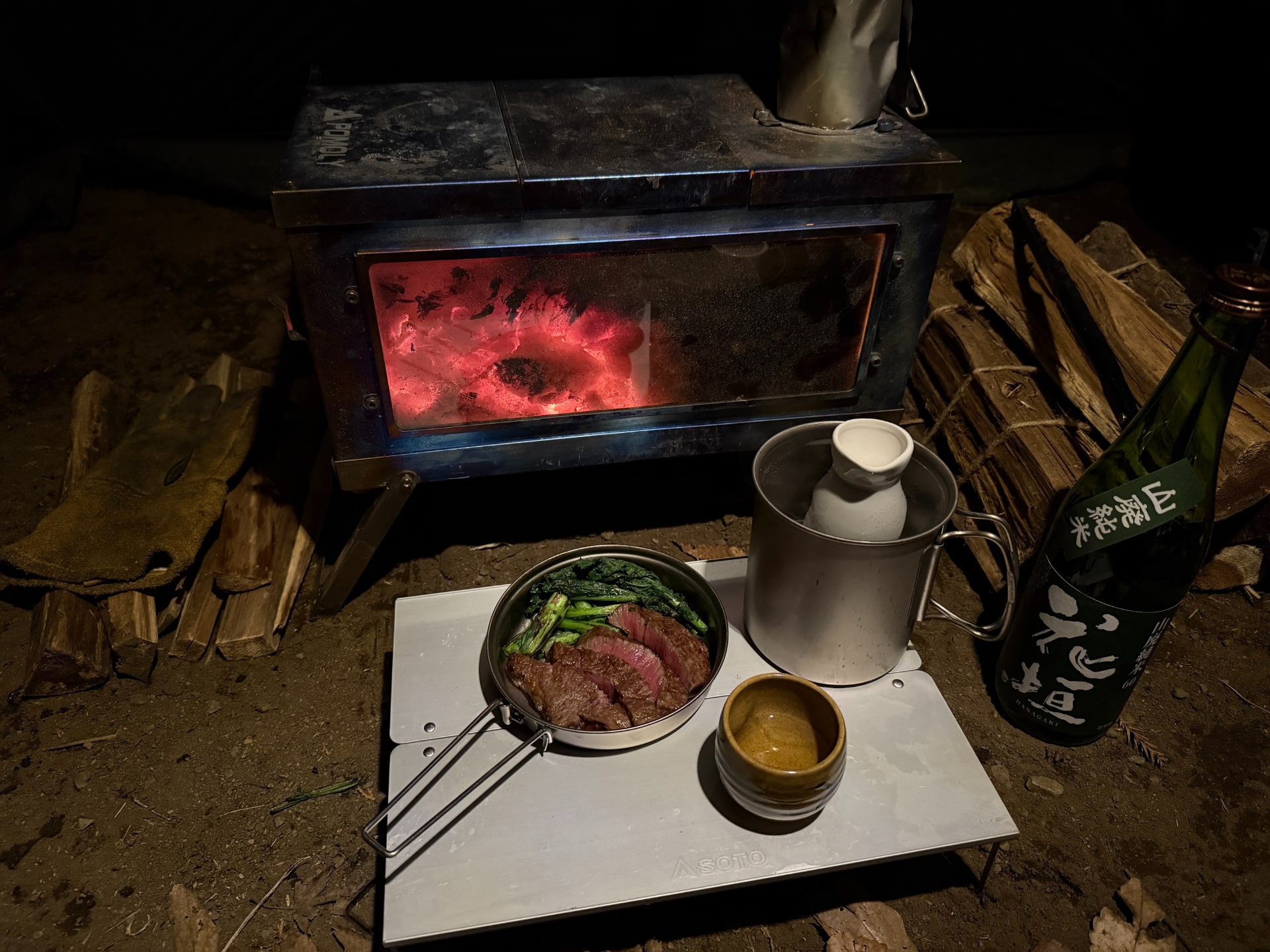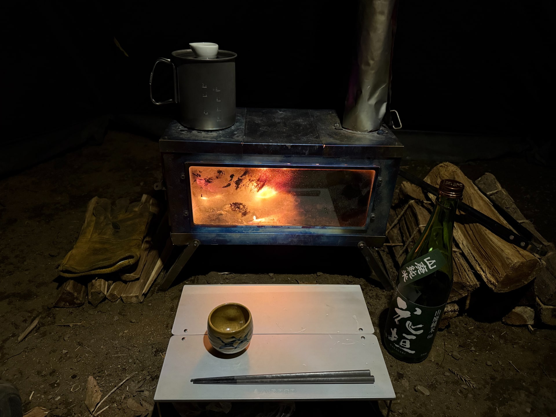 熱燗は旅行先で買った花垣の山廃純米。薪ストーブの上で温めた。