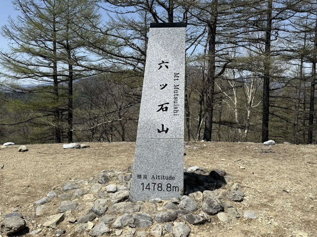ハイペースの登りでだいぶ消耗したが、なんとか六ツ石山に登り切った。遠くにはまだ冠雪している八ヶ岳らしきものも見えた。