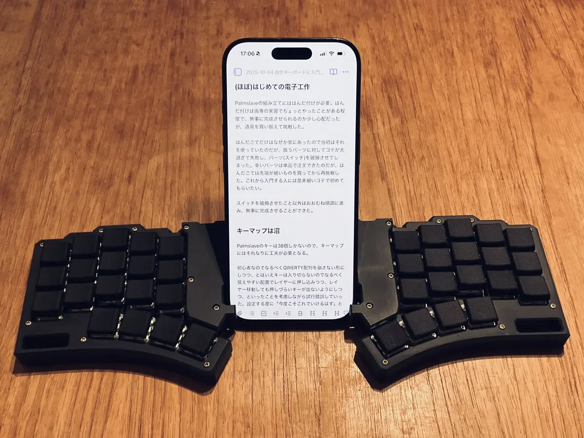 元々キーボードはHHKBを10年以上使っていて満足していたのだが、新卒の同期のtakashicompanyがPalmslaveという良い感じのキーボードを作っていたのを見て気になったので、キットを買って組み立ててみた。